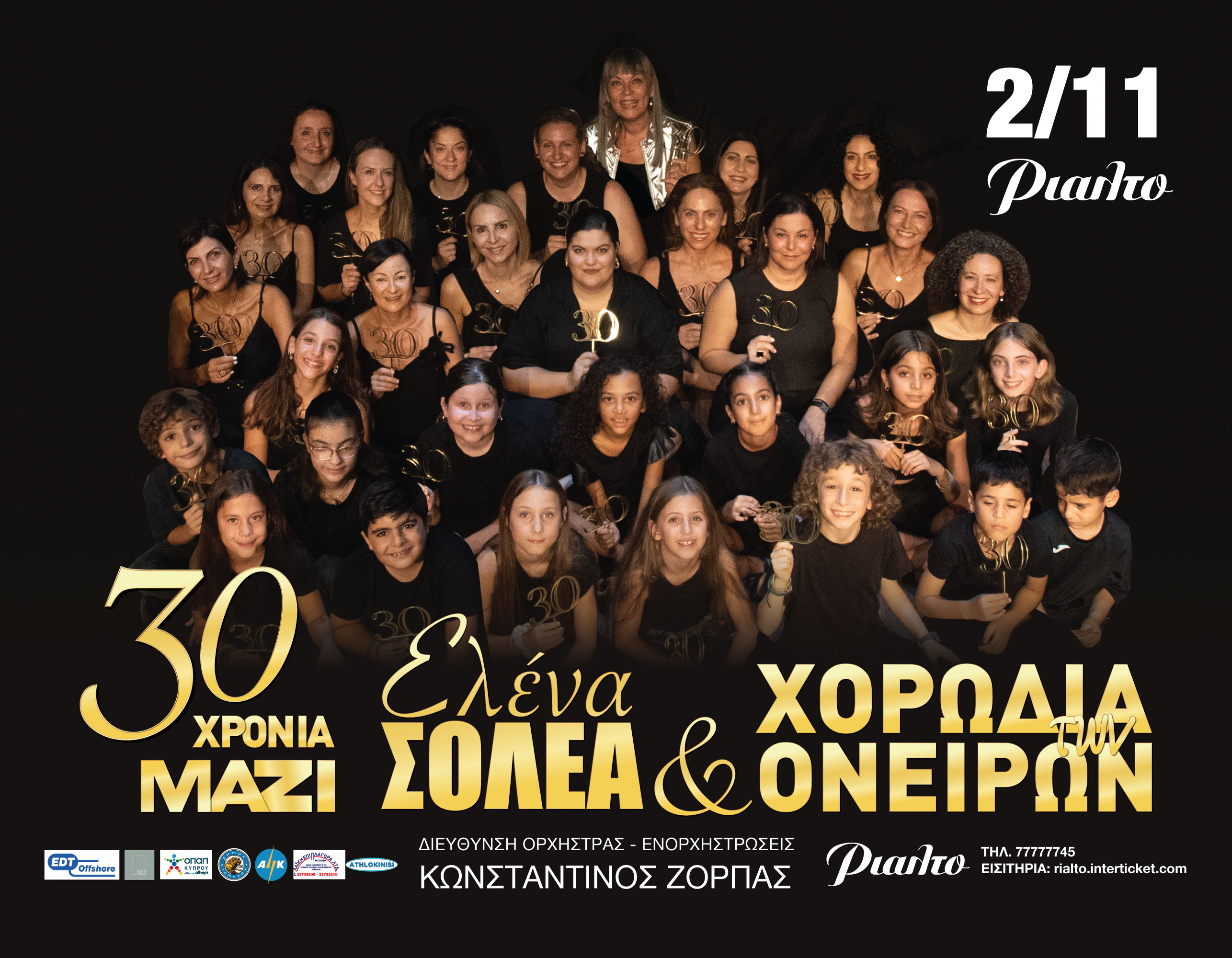 ESTIA Cultural Association proudly presents its grand anniversary concert, celebrating 30 years of the Dreams Choir. This special evening will feature performances by the Women’s Dreams Choir, the Children’s Dreams Choir, and distinguished soloist and conductor Elena Solea, accompanied by a ten-member orchestra under the baton of Konstantinos Zorpas.