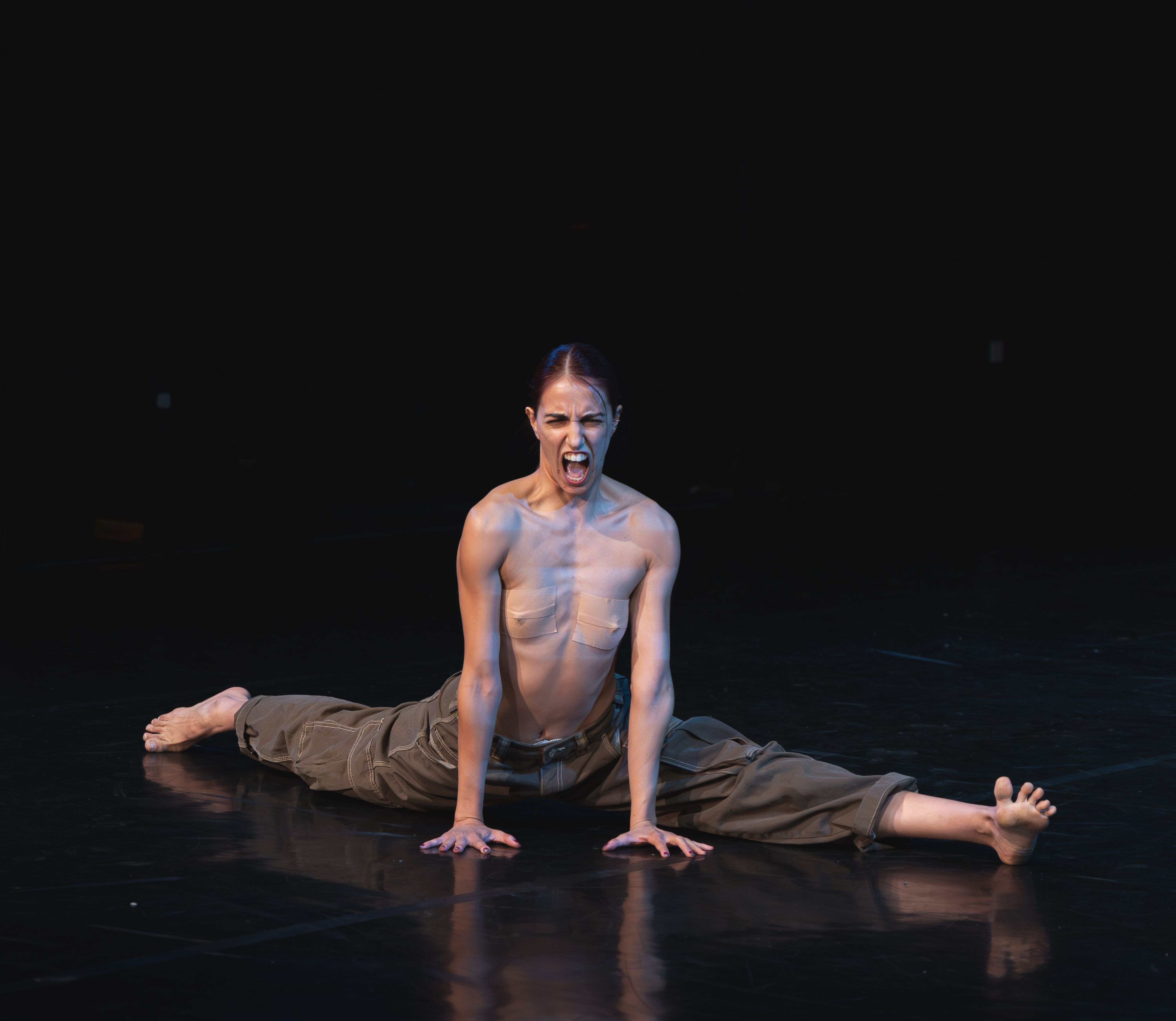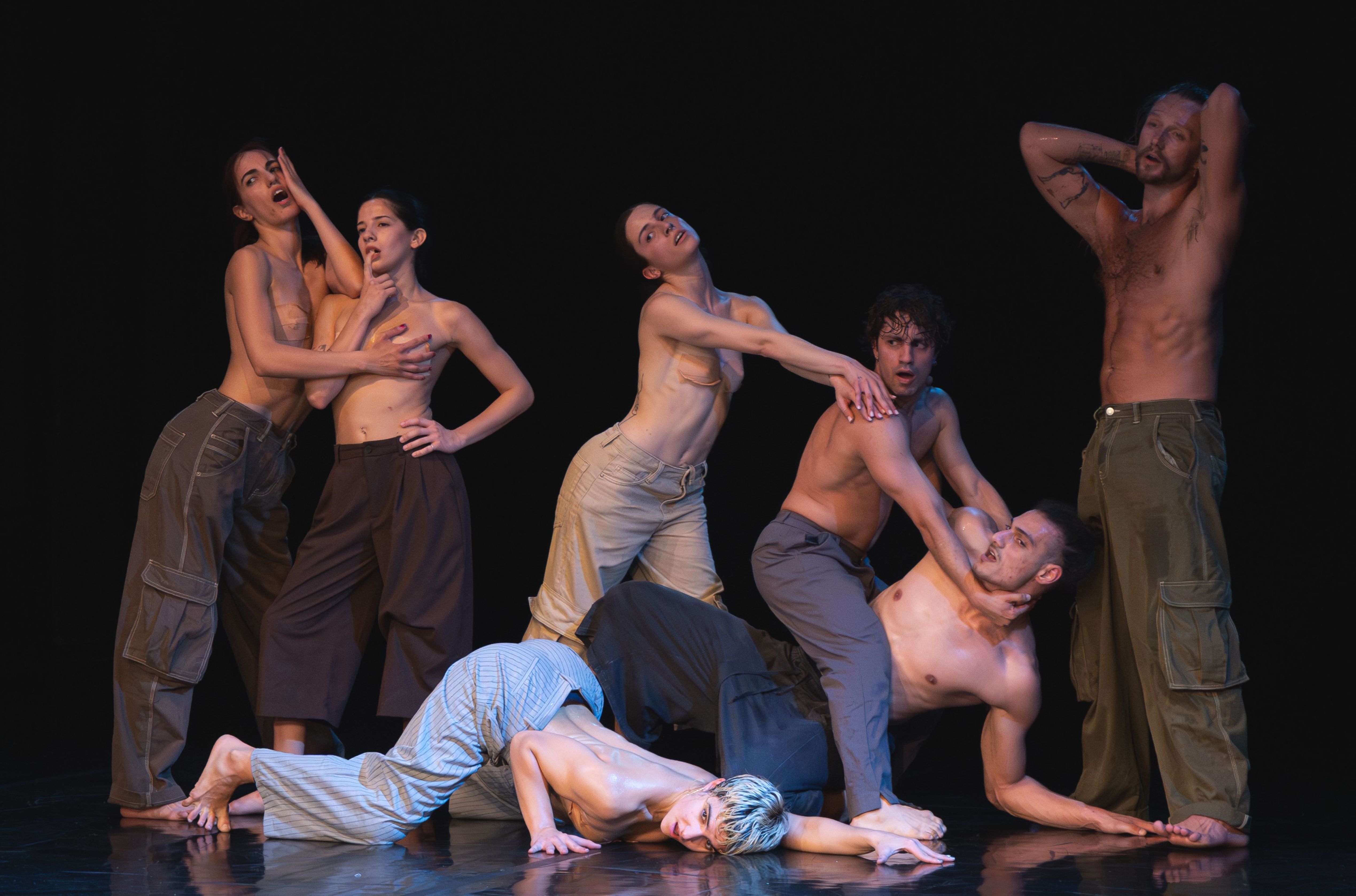 In this gripping performance, the audience is called upon to take responsibility for the dancers’ safety. The instruction “Shout the word STOP if women are in danger” establishes a dual reality: a battle unfolding before the spectators’ eyes and another, invisible one, within their minds. The space is shaped like an arena, with the audience surrounding the action. As the performance unravels, the dancers rely on their sense of hearing and touch—the spectators’ bodies become their reference points in space. Perhaps the real battle is not the one you see, but the one happening inside you.